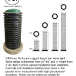 Vertical Pump Tanks by VSI are rugged, tough and watertight. Tanks range in diameter from 24″ – 60″ and in height from 4′ – 20′. Every tank is vacuum tested for leak detection. Concrete anti-floatation ballasts keep tanks in the ground when encountered with high groundwater situations. Risers can be added as needed to accommodate grade level access. Comes with 4″ Entry Hub and 2″ Entry Hub Installed at Customer’s designation. Please note on order the Bottom Elevation of the 4″ and 2″ entry hub from ground level (i.e. from the ground to bottom of pipe).